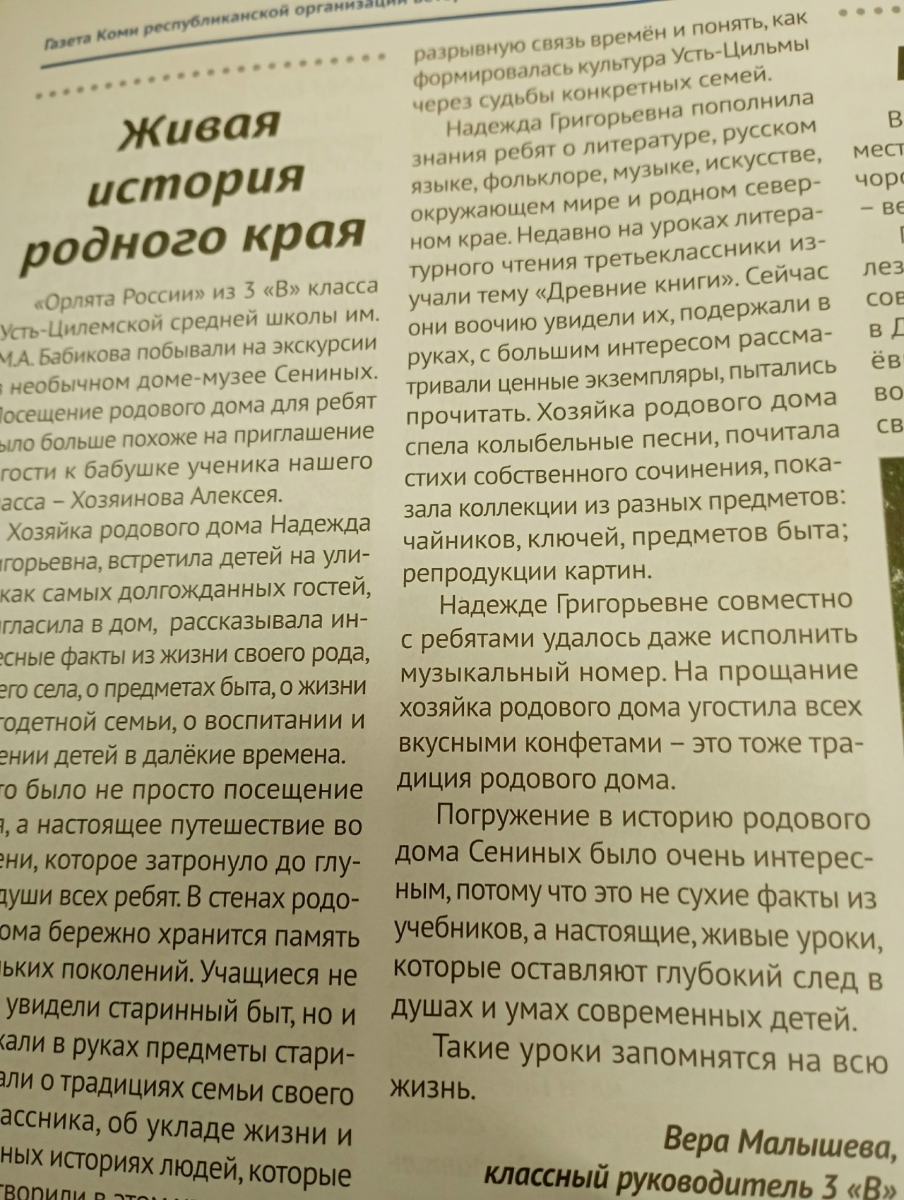 Статья «Живая история родного края» рассказывает о познавательной экскурсии ребят в дом-музей Сениных! А теперь еще о наших юных краеведах знает вся республика!