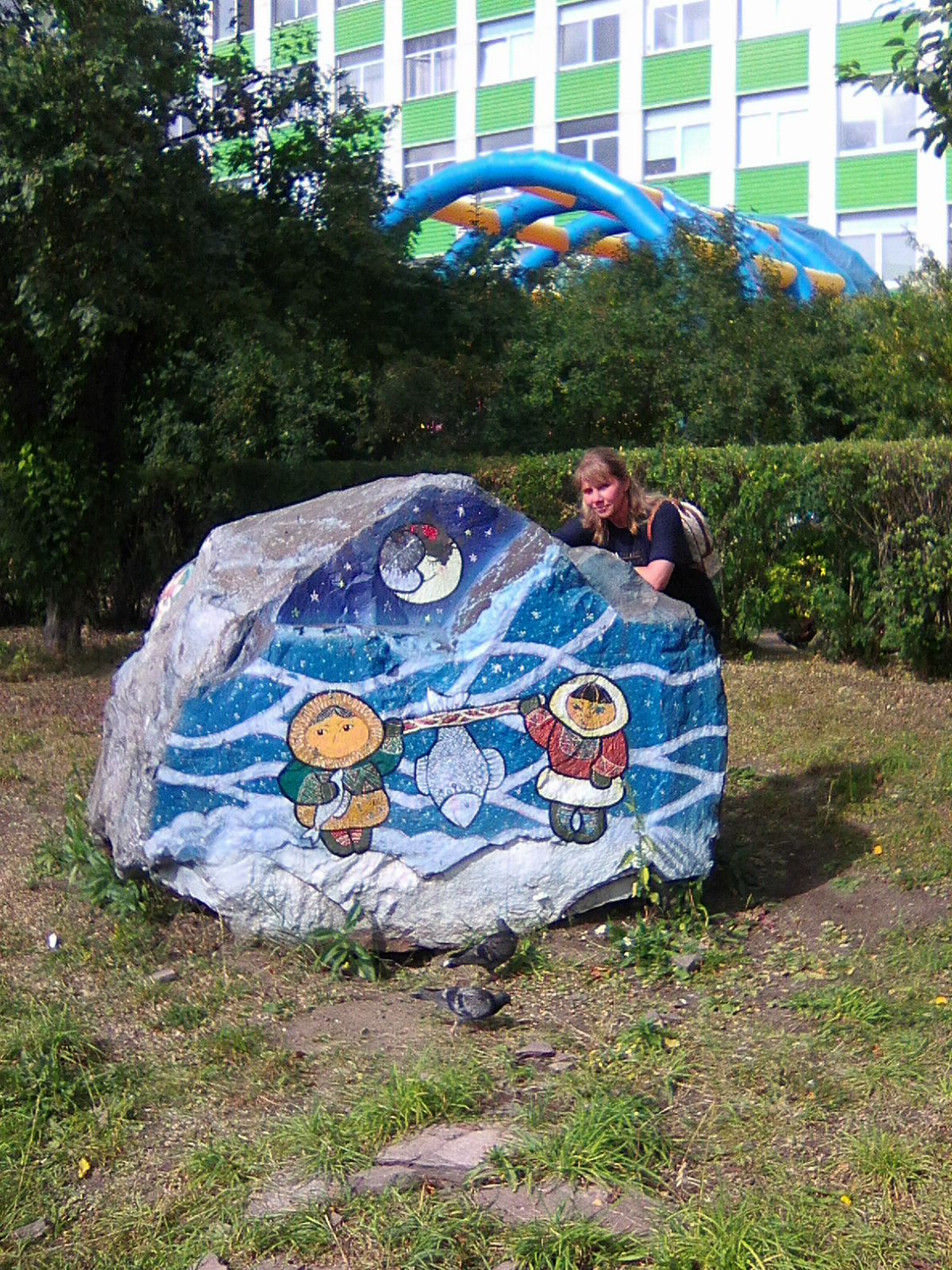 Сквер украшают каменные сказочные звери. Это большие натуральные камни, которые сюда привезли, установили и затем разукрасили в этническом стиле. Эти каменные арт-объекты представляют картинки из мифологии коми народа — изображения зверей и птиц, выполненные в этно-росписи.