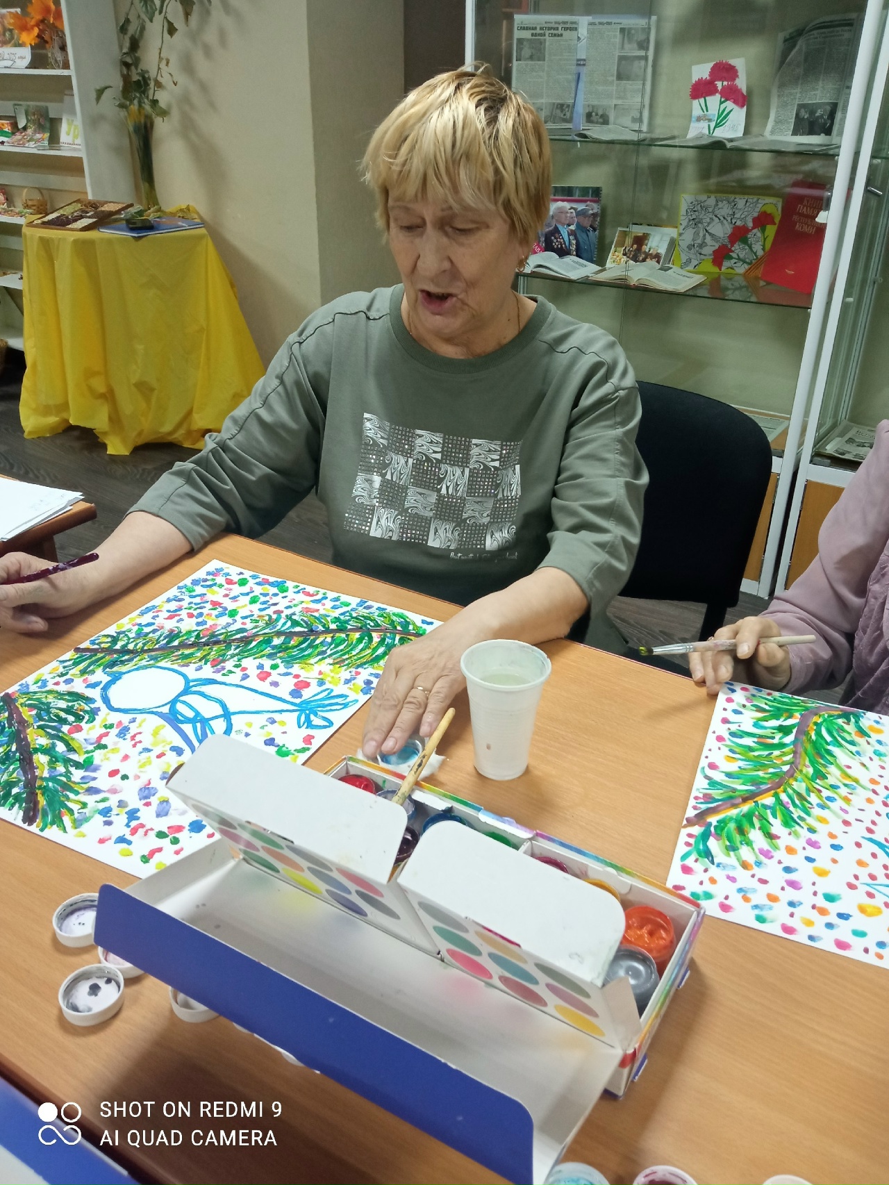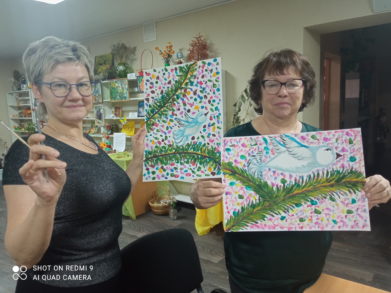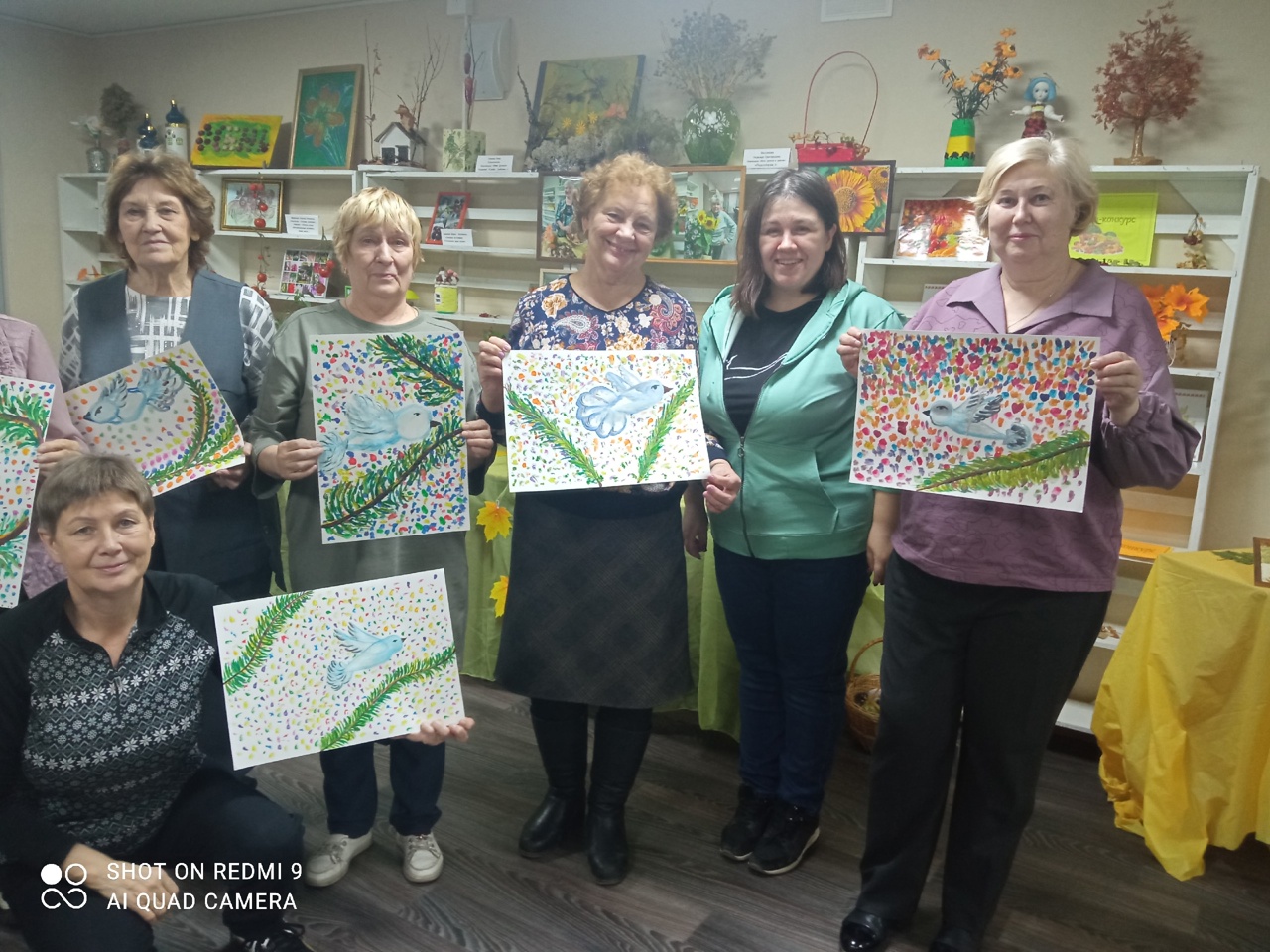 Мастер- класс провела для нас наш верный помощник, талантливый  педагог Юлия Юрьевна Слепова. Всеобщим решением было принято нарисовать Салют Победы, Голубя Мира и веточки еловых деревьев – непростая задача для тех, кто вообще никогда не видел в себе художника. Но вот на поверку вышло совсем неожиданное:  мы рисовали и сами себе удивлялись — получается! Радовались,  как дети! Благодаря Юлии Юрьевне у всех получился и Голубь Мира, и Салют Победы, и веточки ели, пихты и сосны! И в душе поселилась тихая радость в память о тех, кто победил в той страшной войне, спас Родину от фашизма. Великая ПОБЕДА   до сих пор ассоциируется с Голубем Мира и Салютом Победы.
