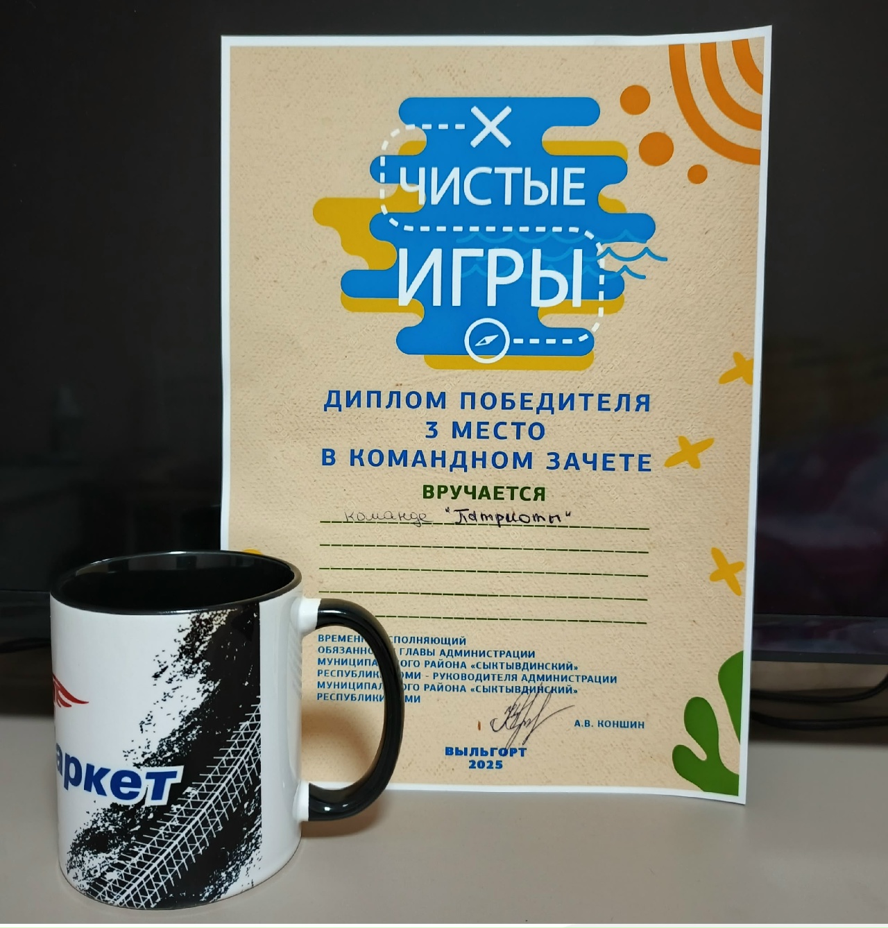 На финише нас ждал горячий чай, сосиска в тесте и подсчет очков…..И — УРА! Наша команда с говорящим названием «Патриоты» из 10 команд заняла 3 место! Первыми оказались «Совет да любовь», вторыми стали «Элитные Варвары». Нас наградили большим арбузом и персонально каждого — кружкой!